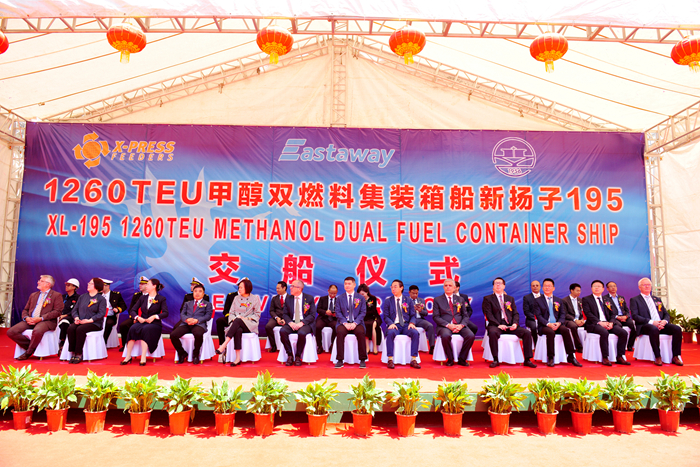 On the morning of May 16, the first 1260TEU methanol dual fuel container vessel built by our group's New Yangzi Shipbuilding for the Singapore shipowner X-Press Feeders signed for delivery. This type of vessel is an open feeder container vessel with a capacity of 1260TEU, which can load four different sizes of containers. This vessel measures 148m in length, 27.2m in moulded width, 14.3m in moulded depth, a scantling draft of 8.1m, a design speed of 14kn, and is equipped with two methanol fuel storage tanks and one methanol daily service tank.